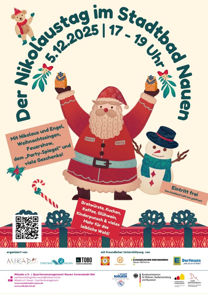 Die zweite Auflage des „Nikolaustags im Stadtbad Nauen“ steht bevor! Nach der großen Resonanz im vergangenen Jahr organisiert der Mikado e.V. als Träger des Quartiersmanagements Innenstadt-Ost Nauen gemeinsam mit dem Nauener Stadtbad und TOBO Veranstaltungsservice auch in diesem Jahr wieder einen stimmungsvollen Nikolaustag. Die Veranstaltung findet am Freitag, den 5. Dezember 2025, von 17 bis 19 Uhr statt.
